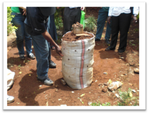 Tools include a watering can that can hold 10 liters and a spade or shovel. Other essential materials include 15 kg of stones (3-5 cm in size) preferably limestone or volcanic, 50 kg of fertile loamy or humus soil, vegetable seeds, 25 kg of fertilizer either compost or manure and a pipe same height of the bag, often 15-20 cm long as shown below. The pipe is used to create a stone vent which allows water to reach soil more efficiently (Peprah et al., 2014).